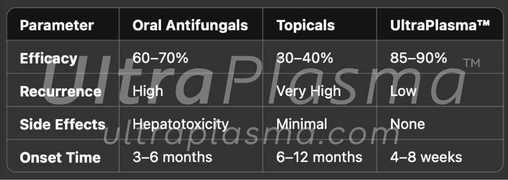 UltraPlasma™ revolutionizes onychomycosis management by combining high-precision thermal disinfection, gas-phase chemistry, and regenerative biophysics. It is particularly effective in cases resistant to systemic therapy or in patients contraindicated for oral antifungals. The layered treatment strategy addresses both superficial fungal structures and deep-seated matrix infections, ensuring long-term resolution.